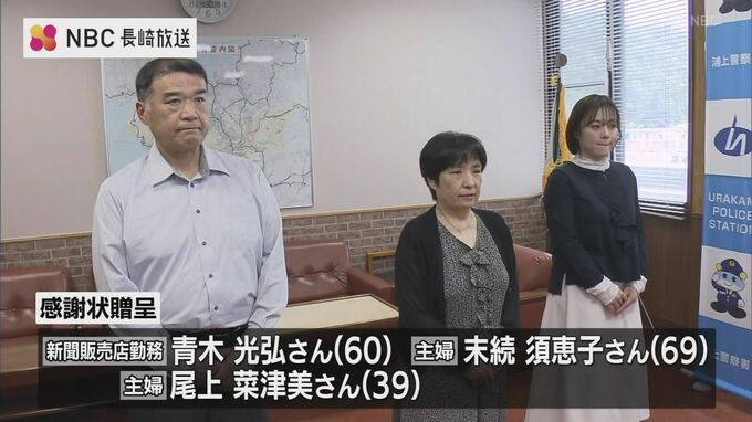 感謝状を贈られたのは、新聞販売店勤務の青木光弘さん60歳と、主婦の末続須恵子さん69歳、それに主婦の尾上菜津美さん39歳の3人です。