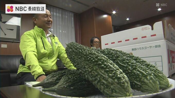 5月8日「ゴーヤーの日」にちなんで地元産をPR 生産者が市長に贈呈 長崎県諫早市 2024年5月8日(水) 12:14 国内 5月8日のゴーヤーの日に合わせて、長崎県諫早市の生産者らが大久保市長に地元産のゴーヤーを贈呈しました。JAながさき県央東部ハウスゴーヤー部会 谷渡亮二部会長:「見てください、色づきがものすごくいいってこ…