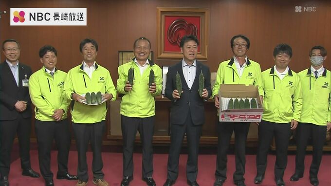 5月8日のゴーヤーの日に合わせて、長崎県諫早市の生産者らが大久保市長に地元産のゴーヤーを贈呈しました。