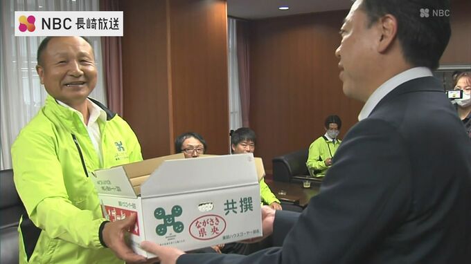 贈呈したのはJAながさき県央東部ハウスゴーヤー部会のメンバーです。部会ではゴーヤーを主に東京や大阪へ出荷し、設立3年目にあたる2022年度に目標販売額1億円を達成。昨年度の販売額は1億1800万円に上りました。