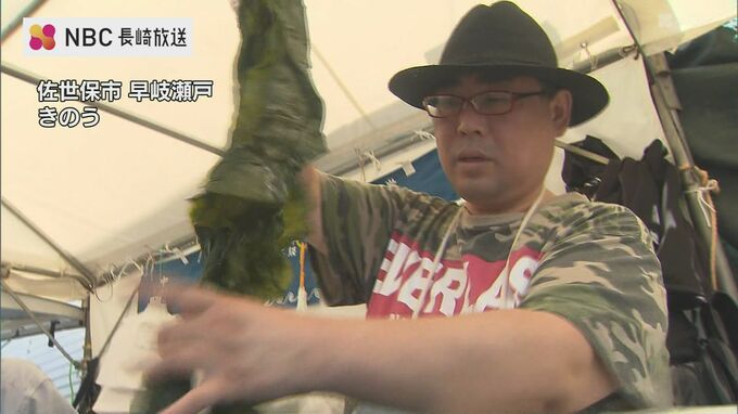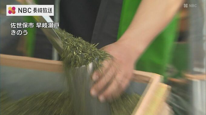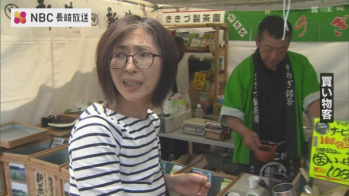 早岐瀬戸沿いに並んだおよそ100の出店では、お茶だけでなく、各地の海産物や特産品なども販売されていて、特に、新茶の詰め放題は人気です。