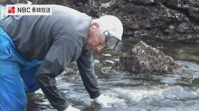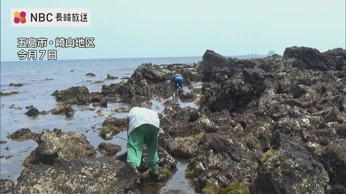 五島市崎山地区のウニ漁が解禁されたのは今月6日で、漁に来た人たちは初夏の味覚であるムラサキウニを、磯かぎという道具を使って手際よく採っていました。