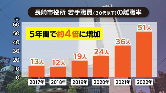 長崎市役所の《30歳以下の離職状況》をみると、2018年度では10人程度でしたが、2022年度には50人を超えていて、5年間で約4倍に増えています。