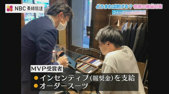 「“全社表彰”を年に1回行っております。(個人で)目標を必ずもっておりますので、目標に対してどれくらい成果を出すことができたかっていうのが基準にはなっています。MVPを取った方に対しては、インセンティブ(報奨金)を支給しているだけではなくって、副賞としてオーダースーツを作っております」