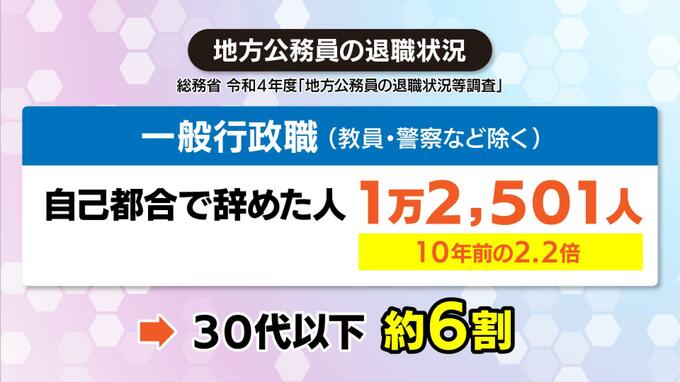 総務省によりますと、教員や警察などを除く一般行政職のうち、2022年度に主に自己都合でやめた人は、1万2,501人で、10年前の2.2倍に増加しています。このうち、30代までの若手職員がおよそ6割を占めています。