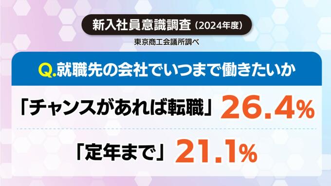 【平】東京商工会議所が今年度の新入社員を対象に行ったアンケート調査(2024年度)では、「チャンスがあれば転職したい」と答えた人が26.4%と「定年まで働きたい」と答えた人の割合を18年ぶりに上回ったということです。