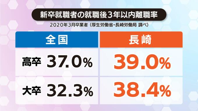 【平】厚生労働省によりますと、全国で就職後3年以内に退職した人は、高卒者で37%、大卒者でおよそ32.3%で(2020年卒)《3人に1人が早期に退職》する状況が続いています。県内の新卒就職者の離職状況は、高卒者39.0%、大卒者38.4%で、全国平均を上回っています。