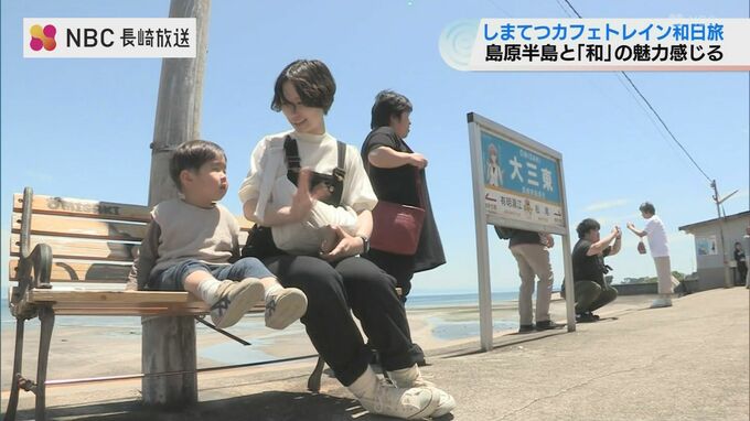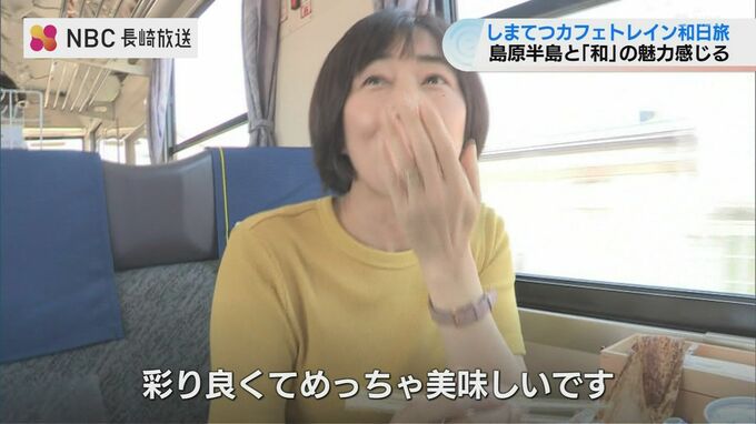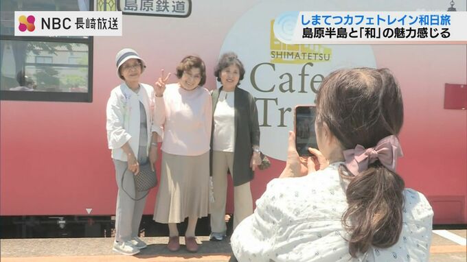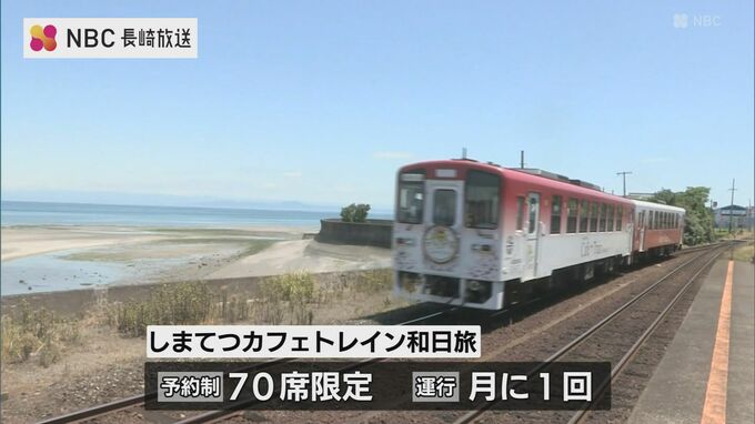 19日、運行を開始した「しまてつカフェトレイン和日旅」列車の中から島原半島の景色や食などを楽しめることに加え和のおもてなしが取り入れられています。