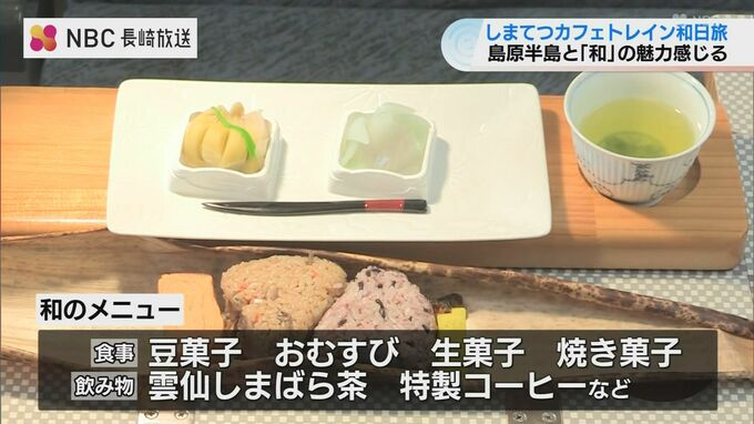 車内では急須でいれる雲仙しまばら茶やおむすびに生菓子などの食事が提供されました。