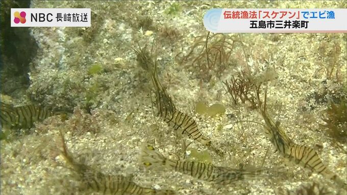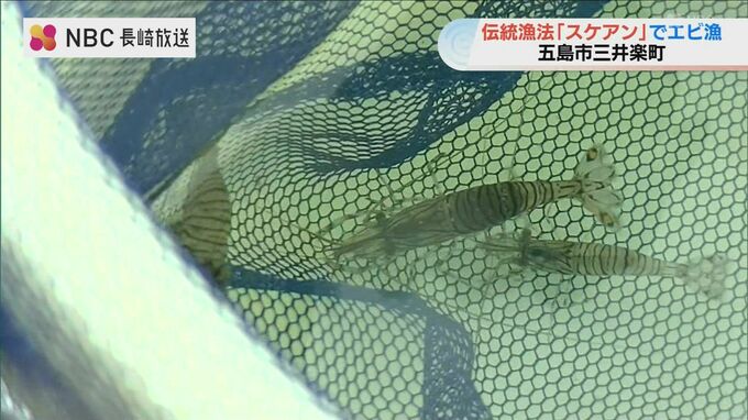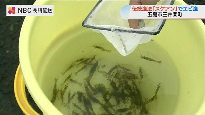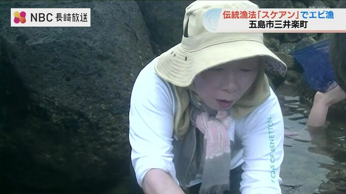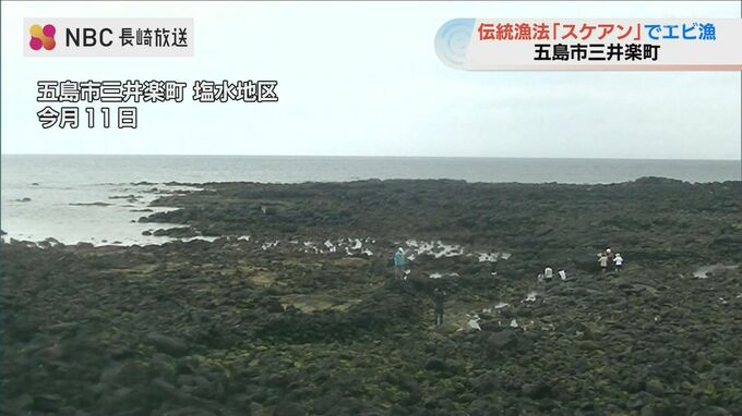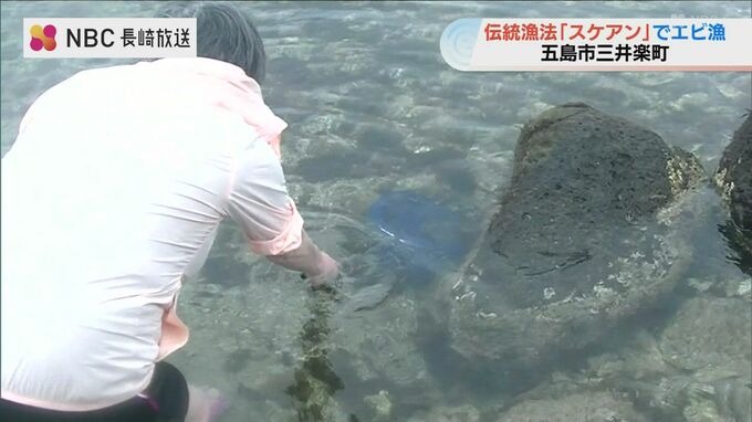 長崎県五島市の海岸では、潮の干満の差を利用した昔ながらの漁法で地元の人たちがエビ漁を楽しんでいます。