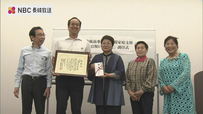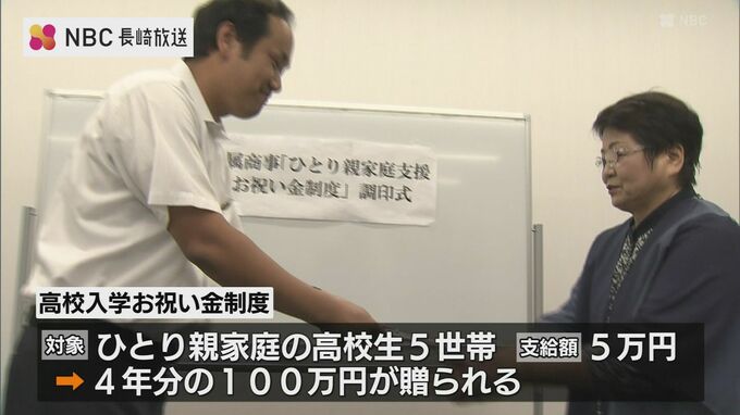 ひとり親家庭を支援している「高校入学お祝い金制度」に長崎県諫早市の企業が再び寄付を行い、26日、目録を贈りました。