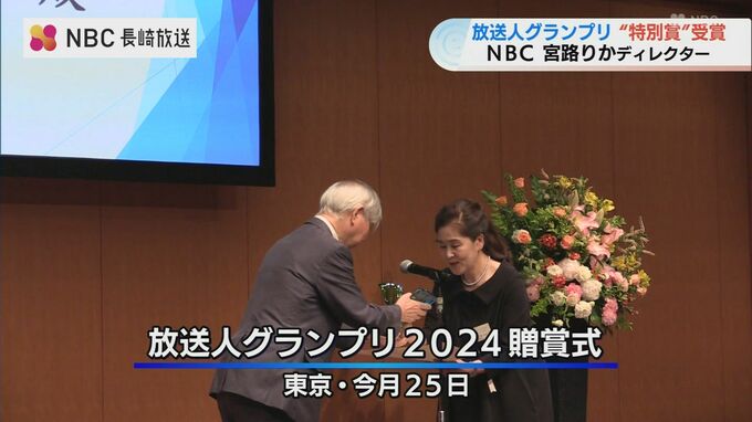 NBCの宮路りかディレクターはこれまで骨が折れやすい難病の高校生を長年にわたり追った番組「大輝、15の春」や松浦市鷹島で暮らす牛の繁殖農家の日常を記録した番組「牛と生きる~長崎・鷹島…あったか家族~」などを制作し数々の賞を受賞。会では30年間にわたり何気ない地域の出来事や人物を拾い上げ伝え続けたことでローカル放送の真髄をみせたなどと評価され、グランプリ特別賞を受賞しました。
