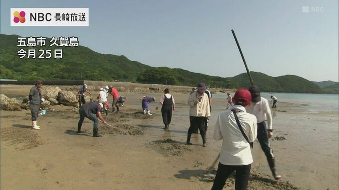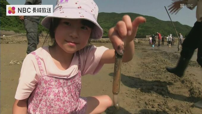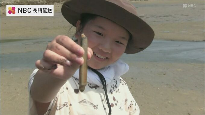 長崎県五島市久賀島で今が旬の「マテ貝」採り教室が開かれ、島の4人の小学生が参加しました。