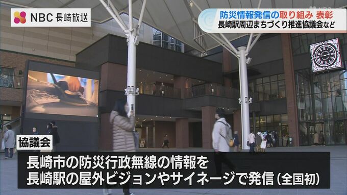 協議会では東京の通信事業者とNBCが共同開発した防災情報配信システムを活用し、長崎市の防災行政無線の情報を長崎駅の屋外ビジョンやサイネージで発信する全国初の取り組みを去年から始めています。これが、地域住民や観光客の安心安全の確保に貢献したとして高く評価されました。