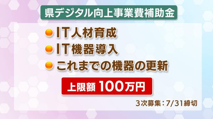 【平】県では、今年秋以降、IT企業やデジタル支援に興味がある会計士などを対象に「サポート企業向けの講座」を開く予定です。さらに「2025年の崖」を乗り越えようとしている企業への支援もあります。県は「デジタル向上支援のための補助金」の制度を作って、IT人材の育成や、IT機器の導入、これまでの機器の更新などについて上限100万円の補助を行っています。