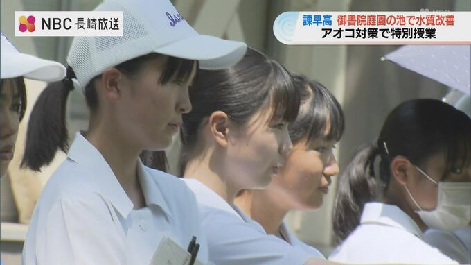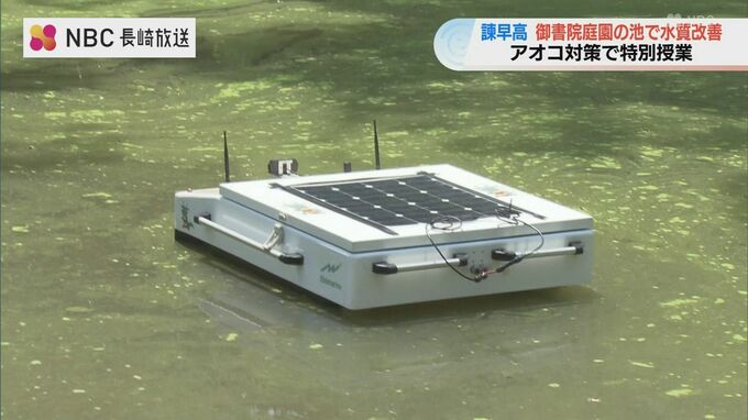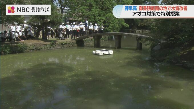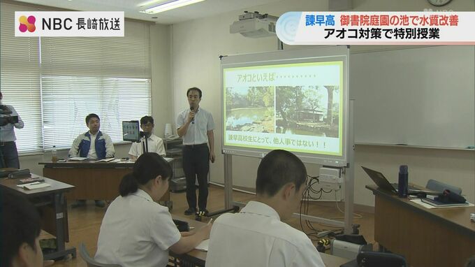 植物プランクトンの「アオコ」で水質が悪化している学校敷地内の池の改善に、生徒たちが地元企業の力を借りながら挑戦する特別授業が、長崎県立諫早高校で行われました。