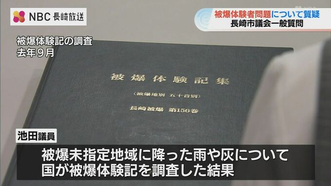 また池田議員は被爆未指定地域に降った雨や灰について国が被爆体験記を調査した結果、雨や飛散物に関する記述は「客観的事実として捉えられなかった」と公表したことを受けて抗議すべきと主張しました。