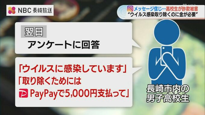 翌日、男子高校生がアンケートに回答したところ「ウイルスに感染しています」「取り除くためにはPayPayで5千円を支払ってください」などとうそのメッセージが送られてきたということです。