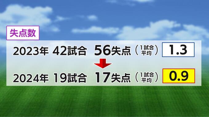 昨シーズンは42試合で56失点。1試合あたりの平均失点が《1.3》でしたが、今シーズンはここまで19試合で17失点、1試合平均は《0.9》です。