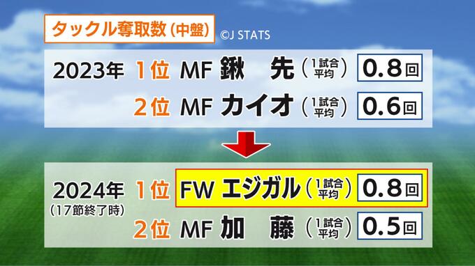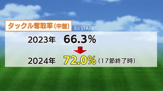 「JSTATS」というJリーグのまとめによりますと、中盤でのタックル奪取率が去年の《66.3%》から、今年は《72%》に増加しています。