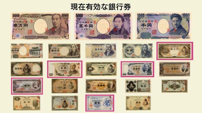 【平】現在使用できる紙幣は、22種類あります。例えば、聖徳太子の1万円札、伊藤博文の千円札、岩倉具視の500円札や板垣退助の100円札も使えます。古いものでは、明治18年発行の大黒天の1円札も使用できます。