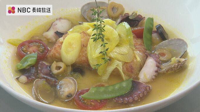 長崎産の新鮮な真だこをあさりや野菜と一緒にソースに仕立てた料理です。長崎市は地元の食材をPRするため、毎月19日を「食卓の日」と定めていて今月19日は市役所のレストランで長崎産の真だこを使ったランチが提供されました。