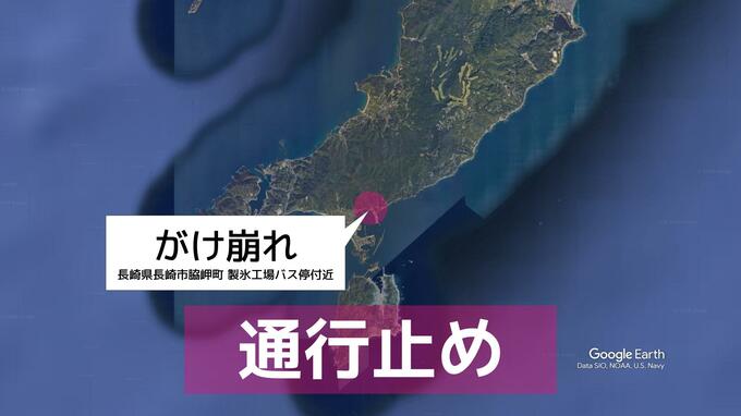警察と長崎振興局道路維持課によりますと、このがけ崩れによる人や住宅への被害は確認されていませんが、さらに崩れることを懸念し、午前8時25分ごろから県道34号線で、付近約150mの区間を全面通行止めにしています。
