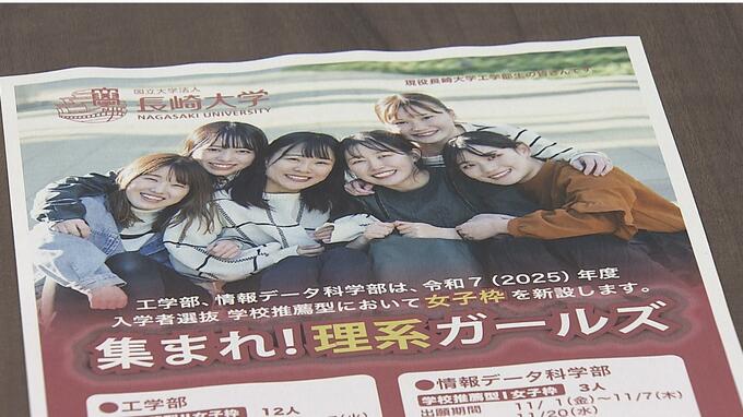 【大学受験】長崎大学が工学部・情報データ科学部に「女子枠」導入 医学部の募集枠も見直しへ 2024年6月27日(木) 14:33 国内 長崎大学は、来年度入学者の選抜から情報データ科学部と工学部に「女子枠」を導入すると発表しました。長崎大学が入学者選抜に「女子枠」を導入するのは初めて。女子学生の割合が低い情報データ科学部と工学部が対…