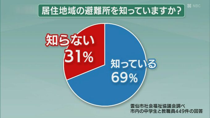 先月、長崎県雲仙市の社会福祉協議会が中学生と教職員に行ったアンケートでも、およそ3人に1人が住んでいる地域の避難所を知らないと回答しました。