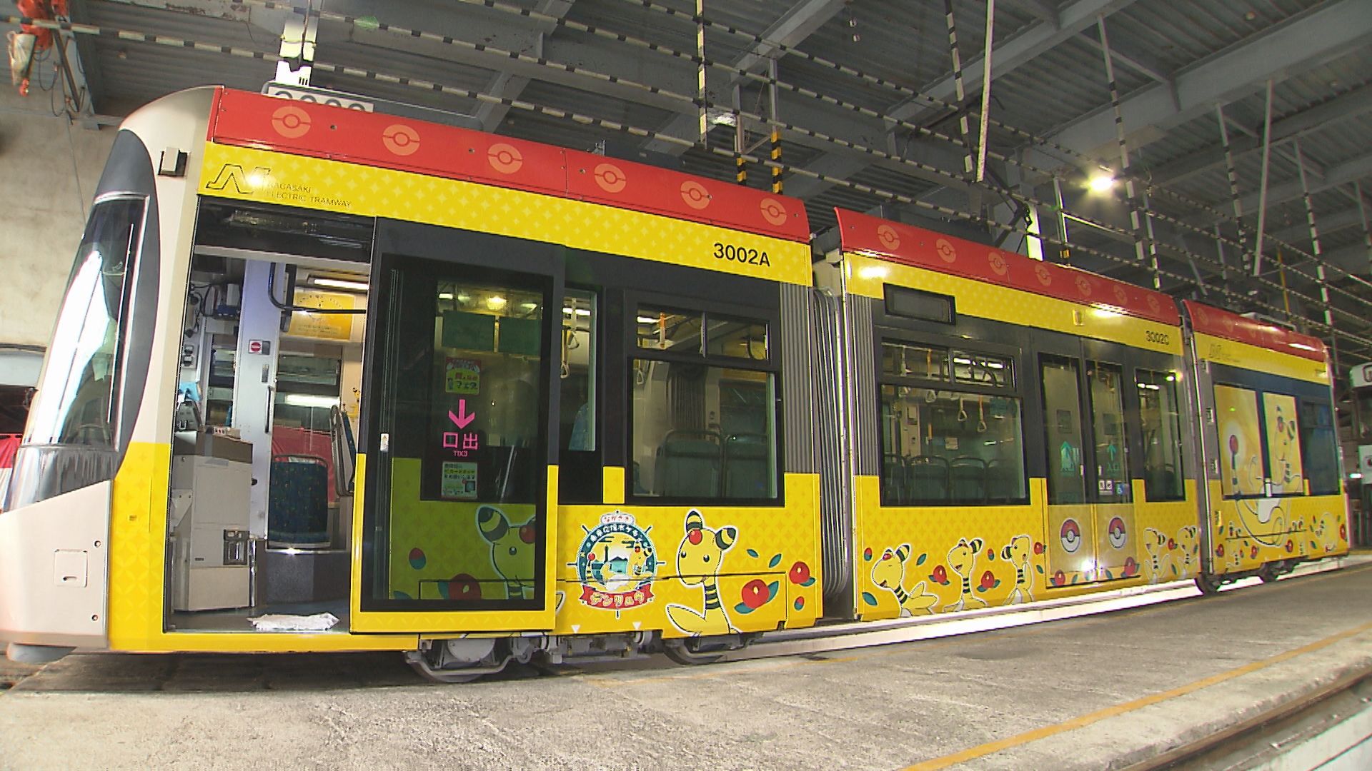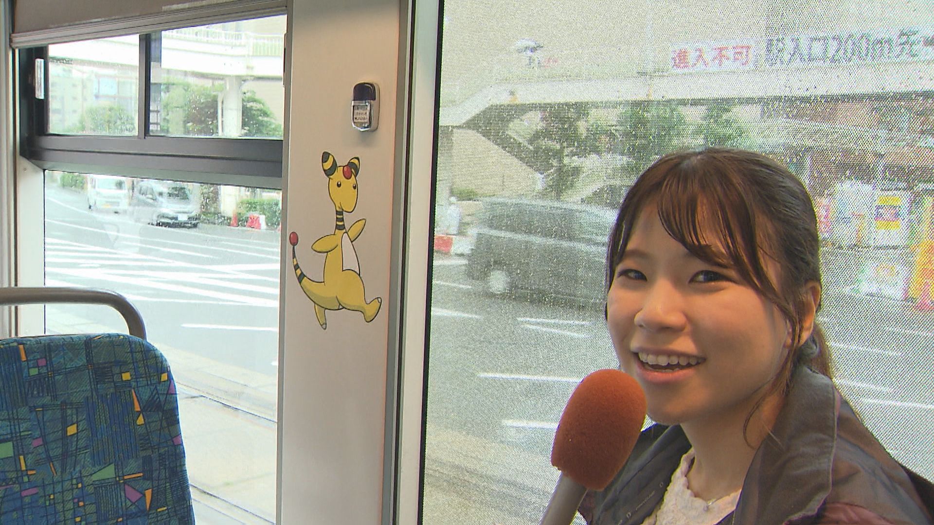28日から長崎市内を走り始め「ラッピング路面電車」。車内にもポケモンの世界観が広がっています。