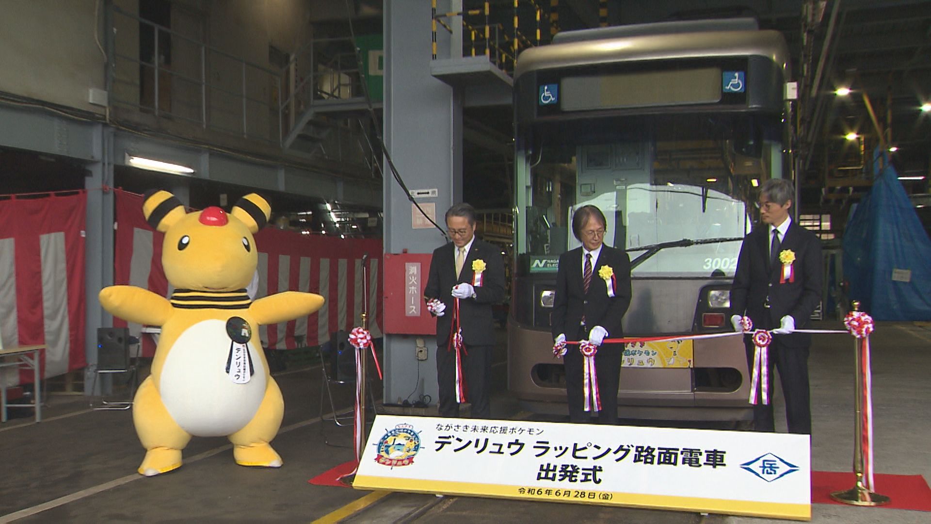 午後からは「デンリュウ」と県の花木「つばき」がデザインされた「ラッピング路面電車」の出発式が行われました。