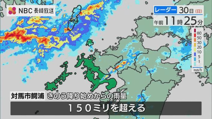 気象台によりますと、梅雨前線や低気圧の影響で県内は大気の状態が非常に不安定となっていて、対馬市鰐浦では29日の降り始めからの雨の量が150ミリを超えるなど対馬で大雨となっています。