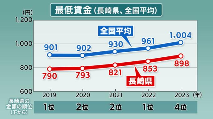 全国最低レベル続く長崎県の「最低賃金」 改正に向けた審議会始まる 2024年7月1日(月) 17:51 国内 全国最低レベルが続く長崎県の最低賃金の改正に向けて、労使の代表らが話し合う審議会が1日始まりました。全国最低レベルが続く長崎県の最低賃金。2019年の790円から、この5年間で100円以上あがり去年898円となり…
