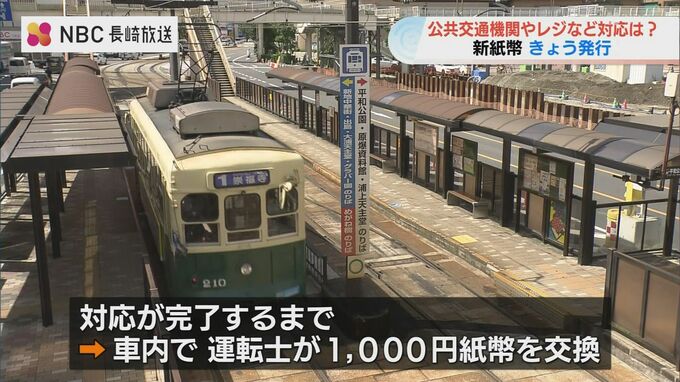 路面電車を運行する長崎電気軌道では、車内での両替・チャージなどへの対応はことしの秋以降に順次行われます。対応が完了するまでの間は、車内で運転士が千円の新紙幣と旧紙幣を交換することにしています。