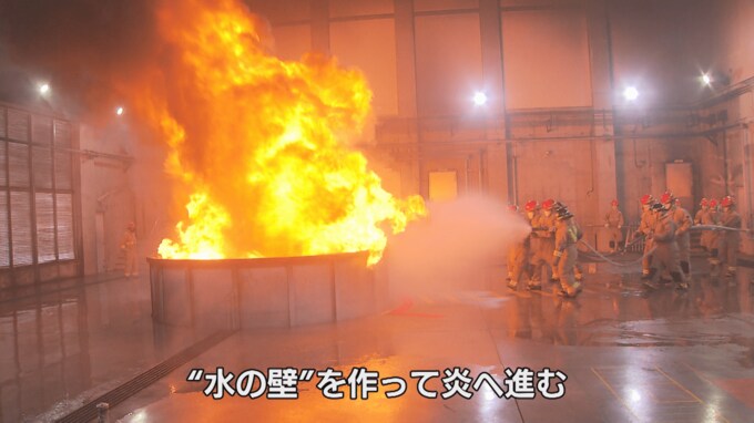横から見ているとウォータースクリーンを作り水の膜で炎を押し返しているように見えたが、実際にそういう要素もあるようで炎に向かって前進するため自らを守る「水の壁」を作っているのだそうだ。