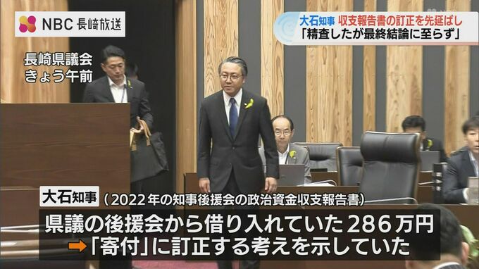 長崎県の大石賢吾知事は、2022年の知事選挙直前に、県議の後援会から借り入れた286万円について、収支報告書を訂正する考えを示していましたが、9日の県議会で訂正を先延ばしたいと説明しました