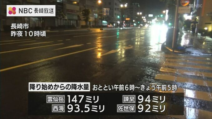 長崎県内では10日朝の降り始めからの雨量が雲仙岳で147ミリとなったほか、諫早市や佐世保市などで90ミリを超えています。