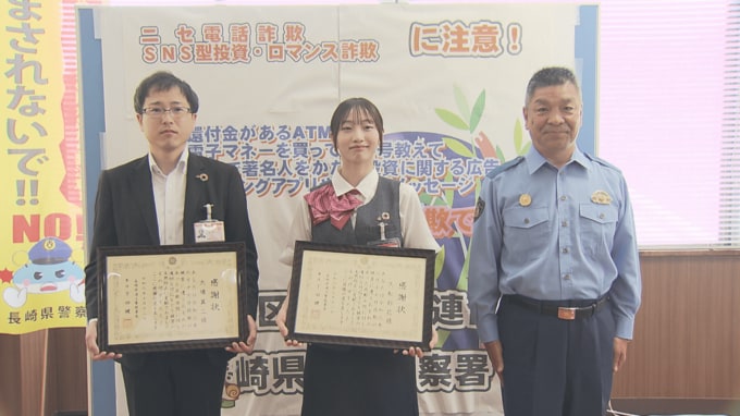 感謝状が贈られたのは、長崎銀行浦上支店の大場真二さんと久松彩花さんです。