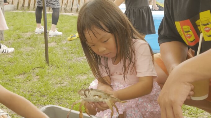 サザエ、カニ、海に生きる生き物におそるおそる‟タッチ”!