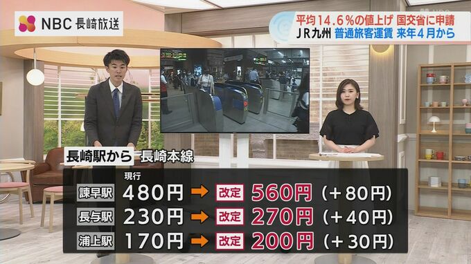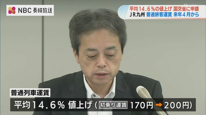 JR九州によりますと、普通列車の運賃は平均で14.6%の値上げで初乗り運賃は170円から200円となります。
