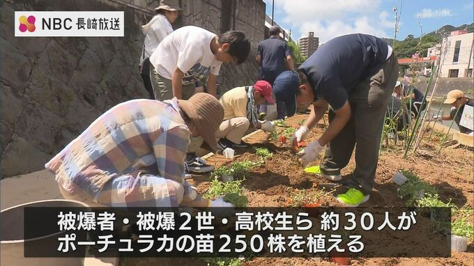 原爆犠牲者を慰霊するため、長崎被災協と被爆2世の会・長崎が10年前から川沿いにあるおよそ20メートルの花壇に、毎年、花の苗を植えています。この日は、被爆者や被爆2世に加え、高校生らおよそ30人がポーチュラカの苗250株を植えました。