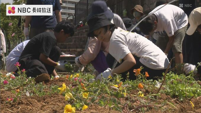 8月9日の長崎原爆の日を前に、長崎市の浦上川の花壇に平和を願って花の苗が植えられました。