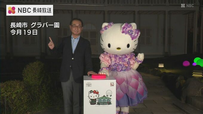 今月19日グラバー園では50周年記念で広報大使に任命されたハローキティとのプロジェクションマッピング点灯式が行われました。