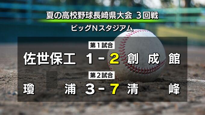 県営野球場で行われた第1試合は「佐世保工」対「創成館」。佐世保工業が初回に1点を先制したものの、連覇を狙う創成館が終盤8回に2点を奪って逆転し接戦を制しました。第2試合は「瓊浦」対「清峰」。大量7点を奪った清峰が7対3で瓊浦に勝利しました。