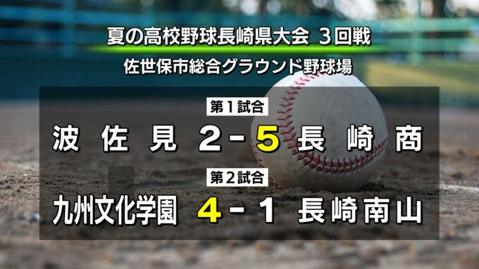 佐世保野球場の第1試合は「波佐見」対「長崎商」。波佐見が2点を先制するも、長崎商業が5回に同点に追いつきさらに7回に3点を奪って逆転勝利しました。第2試合は「九州文化」対「長崎南山」。着実に点数を重ねた九州文化学園が4対1で長崎南山に勝ちました。