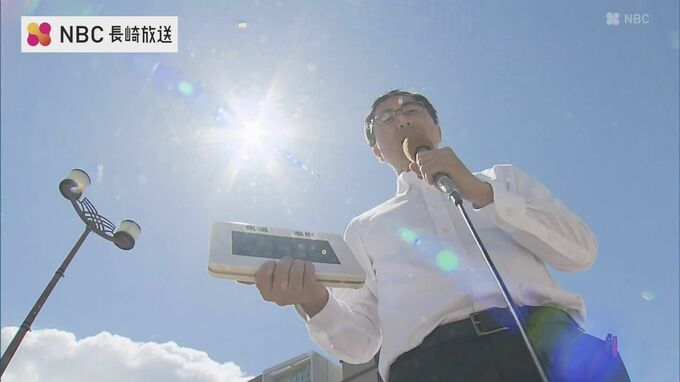 「長崎市内も強い日差しに照らされています。手元の温度計で37度を指しています」