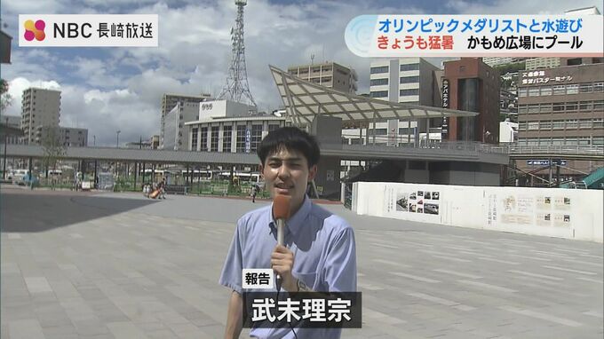 「アミュプラザ長崎前にいます。じわっと汗がにじむような暑さです。見てください!かもめ広場一帯がプールになっています!」