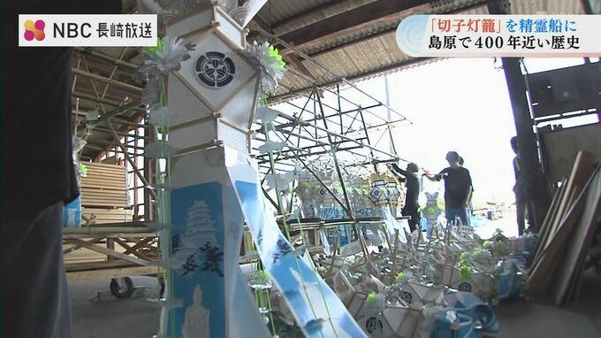 島原市では、初盆を迎えた家に飾られた切子灯籠を集め精霊船に飾りつける作業が行われています。