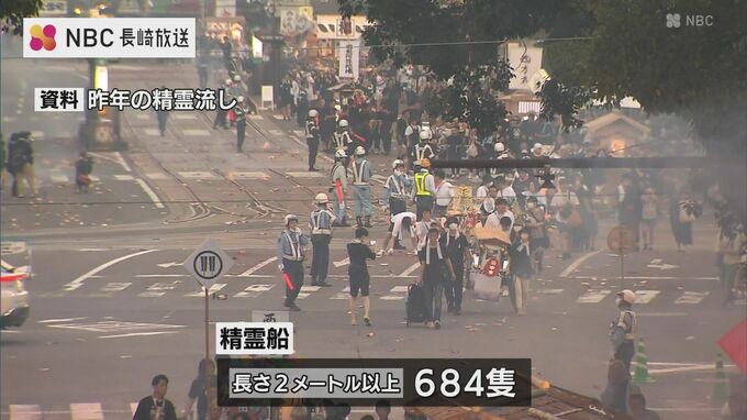 長崎県警によりますと、15日夜行われる精霊流しでは、届出が必要な長さ2メートル以上の精霊船が、県内であわせて684隻流される予定で、15日の午後からは各地で交通規制が行われます。このうち長崎市では崇福寺から大波止までの区間や長崎駅前交差点から元船町の玉江橋交差点までの区間などが午後5時から車両通行禁止となります。