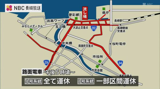 また長崎市内を走る路面電車も、午後5時ごろから4号系統の全線と1号系統の一部区間が運休となります。